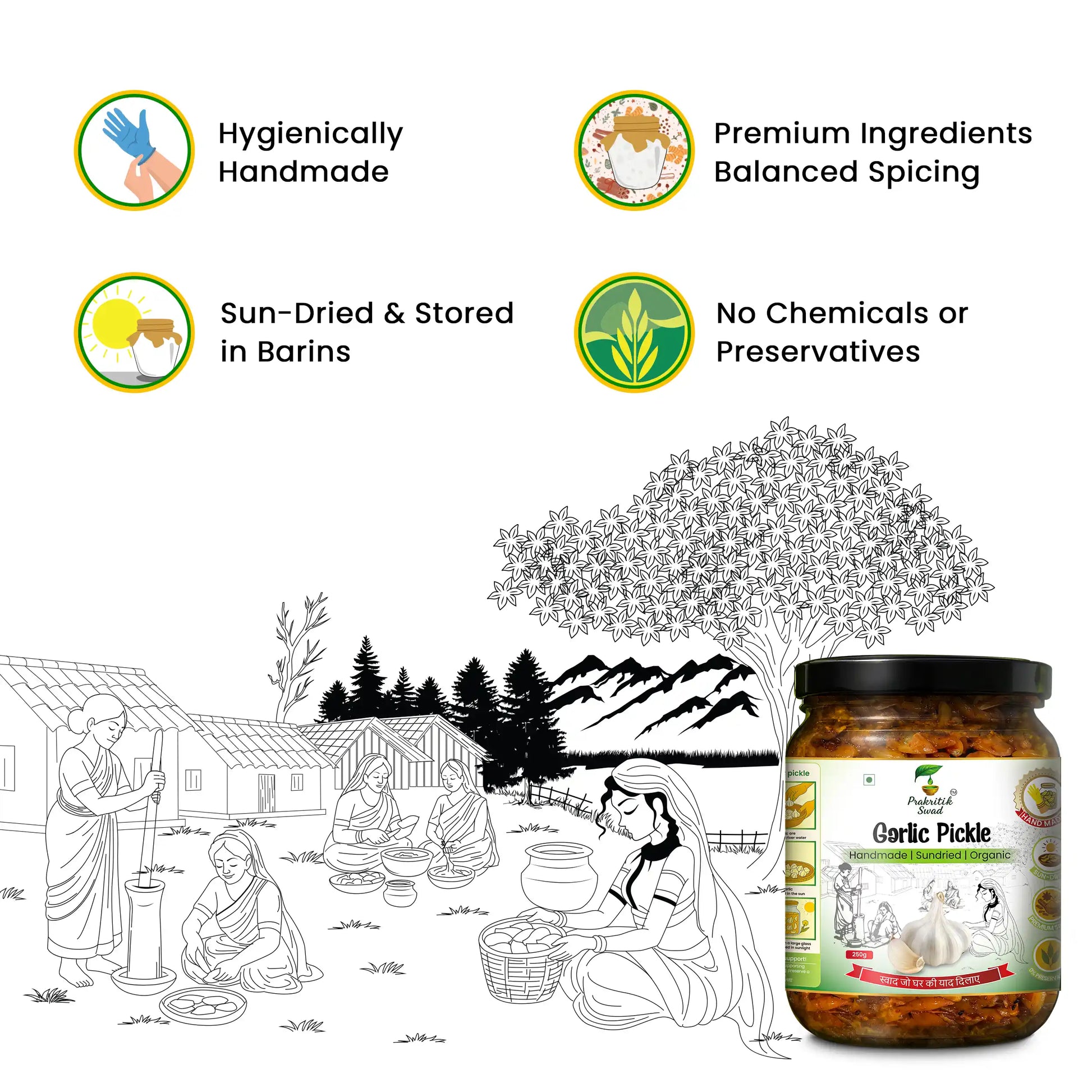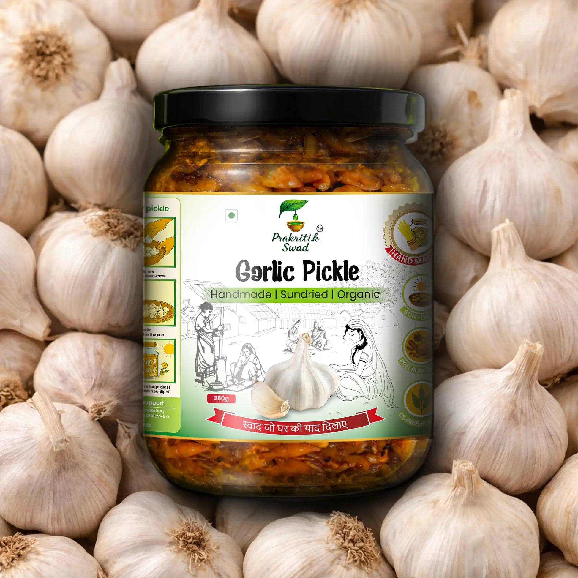 Handmade Garlic Pickle prepared using whole garlic cloves, mustard oil, and traditional spices. Made in small batches using a village-style recipe. Preservative-free, no artificial colours or flavours—bold homemade taste.