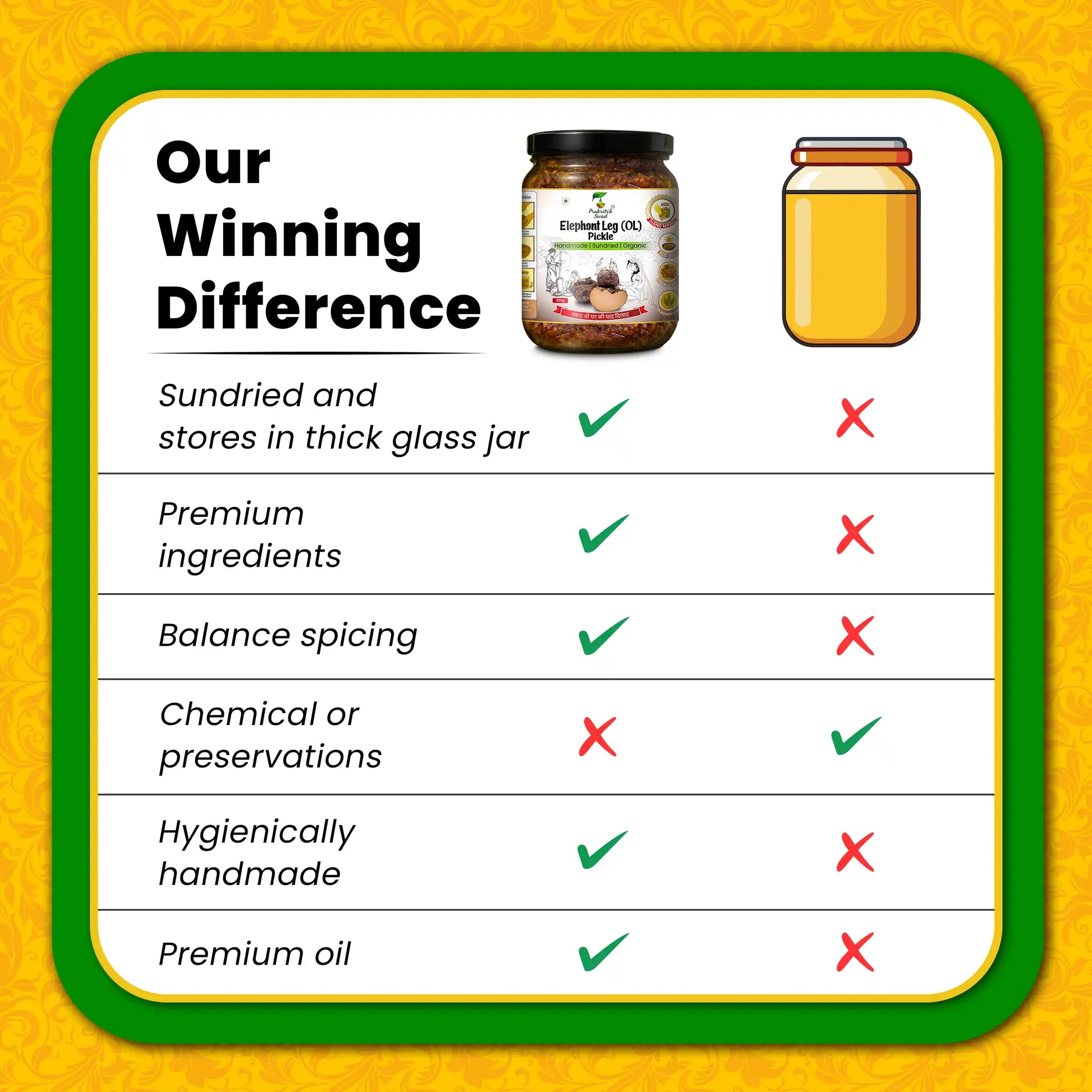Traditional Oal (Yam Foot) Pickle prepared using yum pieces, mustard oil, and handcrafted spices. Small-batch and naturally matured. Preservative-free, no artificial colours or flavours—authentic regional achar taste.